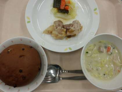 チョコチップパン・牛乳・鶏肉のアップルソース・ピクルス・クリームスープ