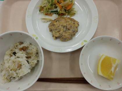 黒大豆ごはん・牛乳・豆腐入りさくさくつくね・かみかみサラダ・くだもの