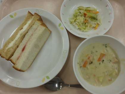 二色サンド・牛乳・シーフードシチュー・アスパラガスのサラダ