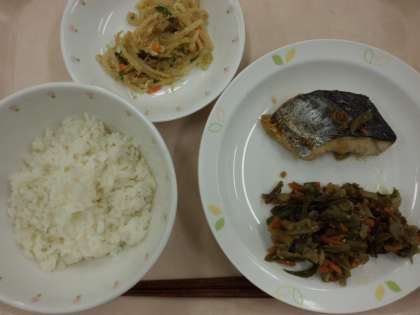 ごはん・牛乳・ごま酢かけ・さわらのしょうが風味焼き・くきわかめのきんぴら
