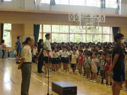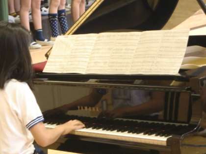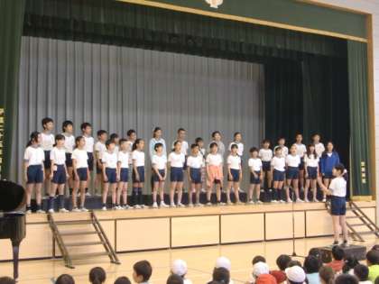 今朝の校長先生のお話は、仙川を歩いていて、カルガモのひなが卵からかえっているのを見かけたことについてでした。今朝の歌は6年5組。「平和の鐘」をみんなで聴きました、