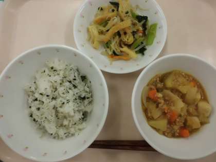 わかめとじゃこのごはん・牛乳・じゃがいものそぼろ煮・カリカリ油あげと野菜のおひたし