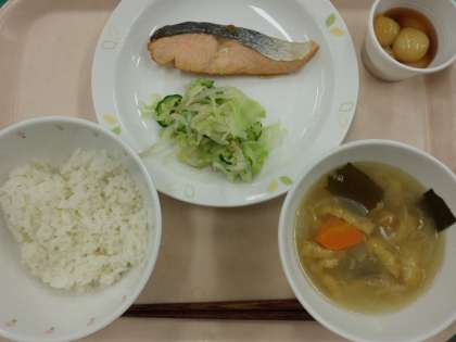 麦ごはん・牛乳・ますの南蛮焼き・ひと塩野菜・たまねぎのみそ汁・みたらしだんご