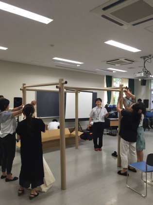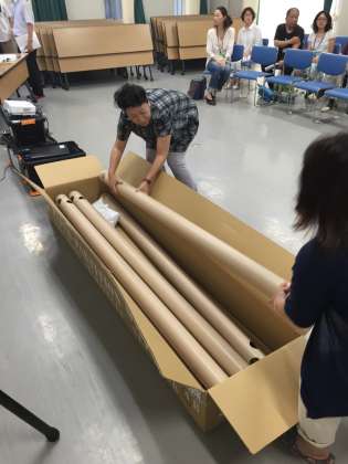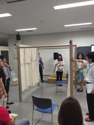 まず、先の熊本地震の避難所でも活躍した間仕切りのセット、段ボールの柱と綿の布で組み立てる体験をしました。約5分ほどで完成します。
