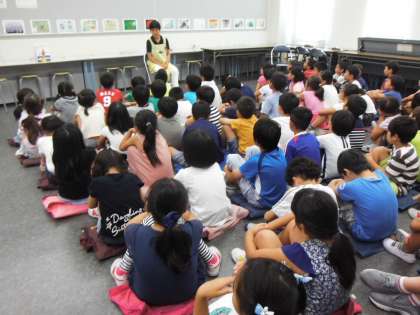 いっしょにお話を言ったり、絵を見たり、体を動かしたりして、楽しい1時間を過ごさせていただきました。