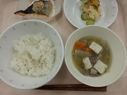 ごはん・牛乳・鮭のねぎ塩焼き・キャベツの甘酢かけ・豚汁