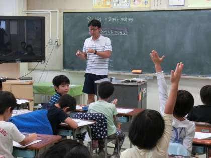 2年生の算数の授業では、三角形や四角形の図形についての授業をしています。教室では上祖師谷中学校の生徒が職場体験として授業のお手伝いをしてくれています。2年生の子どもたちもよく話を聞いていました。