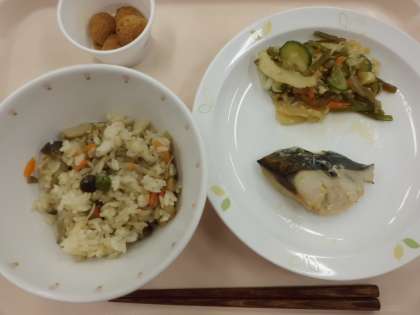 きのこごはん・牛乳・さわらの西京焼き・くきわかめのサラダ・月見だんご