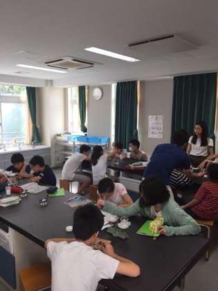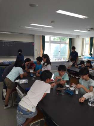 てんびんを使って、水に塩を溶かし、釣り合いを確かめています。