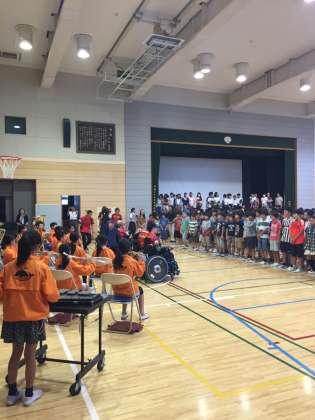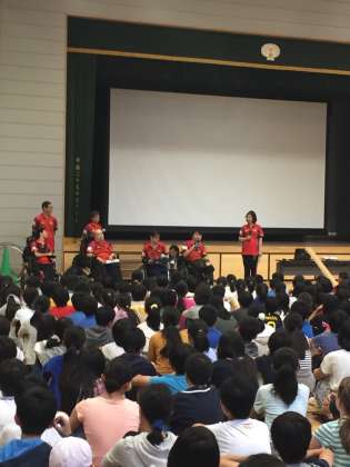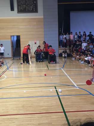 今年はパラリンピックの競技、ボッチャの選手をお招きしました。Noble Wingsの皆さんです。まずは、お話をお聞きし、模範演技を見せていただきました。