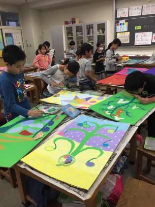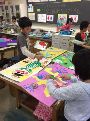 ふしぎなたねから。想像したふしぎな花や植物に合う描く道具を選び、表し方を工夫します。