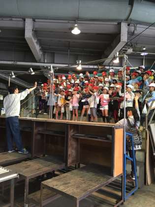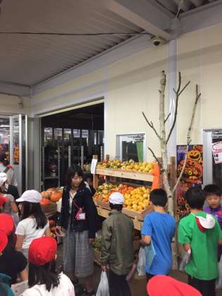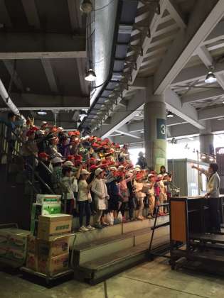 花きの仲卸業者のお店を通って、青果のせり場に来ました。せりで使う数字の表し方を習いました。