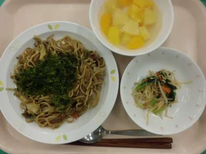 ソース焼きそば・牛乳・ナムル・フルーツ白玉