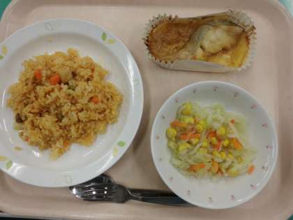 チキンライス・牛乳・たらのチーズ焼き・コーンサラダ