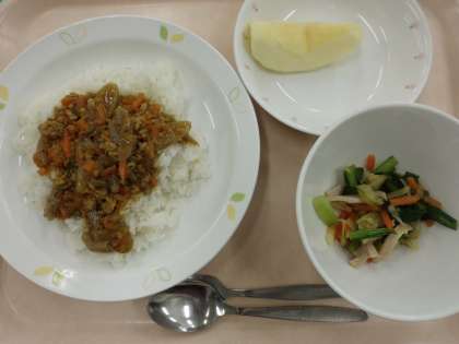 ごぼうの和風ドライカレー・牛乳・小松菜サラダ・くだもの