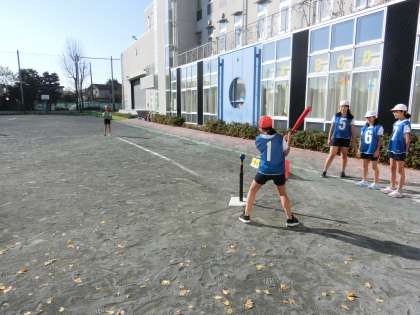 6年生の校庭での体育の授業ではティーボールをやっています。