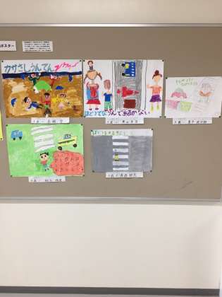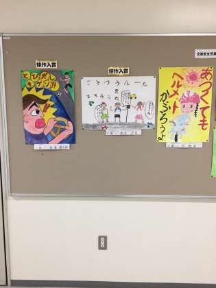 秋の交通安全週間に合わせて、本校の児童が応募したポスターが、体育館前に掲示されています。