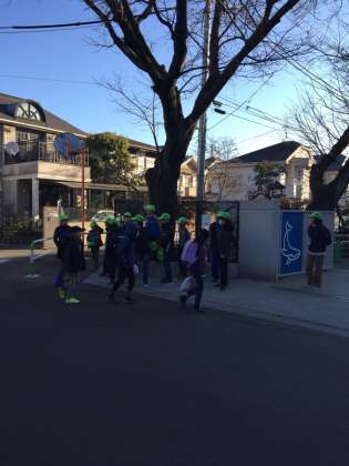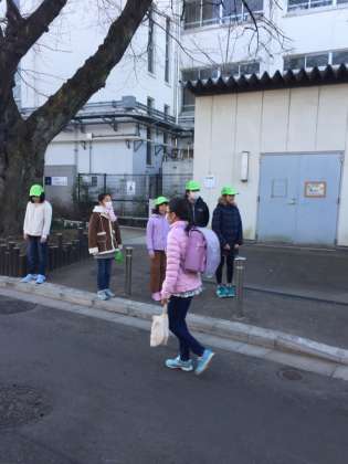 今朝はいくらか暖かい朝です。5年生があいさつ当番です。