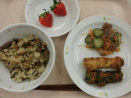 磯おこわ・牛乳・ちくわの二色揚げ・こんにゃくサラダ・くだもの