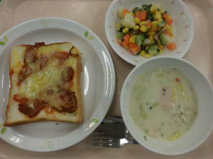 ピザトースト・牛乳・白菜のクリームスープ・マセドアンサラダ