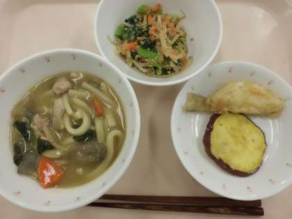 けんちんうどん・牛乳・きすとさつまいもの天ぷら・ごまあえ