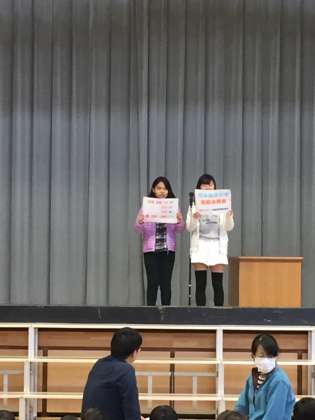 PTAからはベルマークの収益で購入したものの紹介、ボランティア国際委員会からは熊本地震の被災者への義援金募金のPRがありました。