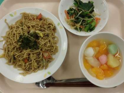 ソース焼きそば・牛乳・ナムル・フルーツ白玉