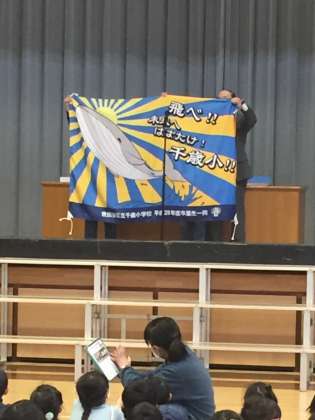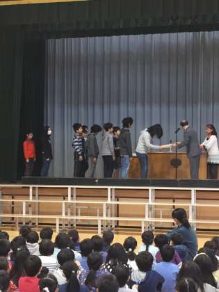 続いて、児童館のドッジボール大会の表彰と6年児童と保護者が寄贈してくださった旗の紹介がありました。校長先生からは1年間あいさつを頑張った6年生にお褒めのお話がありました。