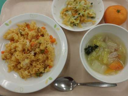 チキンライス・牛乳・ベーコンと白菜のスープ・パリパリサラダ・くだもの