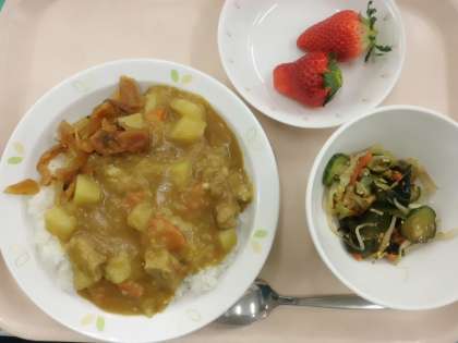 カレーライス・牛乳・福神漬け・和風サラダ・くだもの