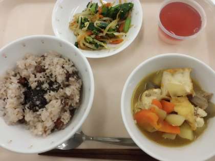 赤飯・牛乳・豚肉と生揚げのうま煮・野菜のごまだれかけ・二色ゼリー
