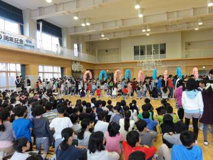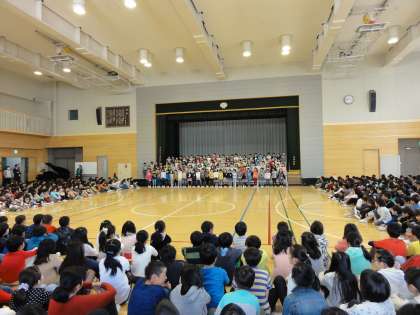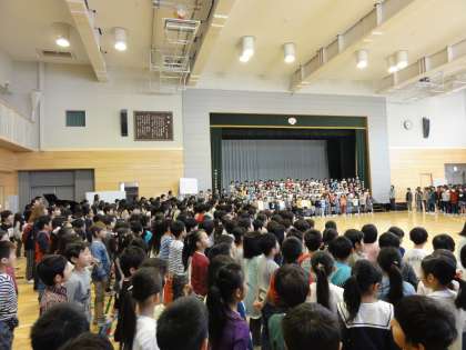 1年生をむかえる会では、4年生のリコーダーの演奏で、6年生といっしょに1年生が入場しました。2・3・5年生が協力して作ったぶんぶんゴマを1年生にプレゼントしました。また、千歳小学校にまつわるクイズをしたり、世界中の子どもたちをみんなで歌ったりしました。最後に1年生がお礼の歌を披露しました。