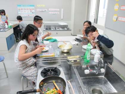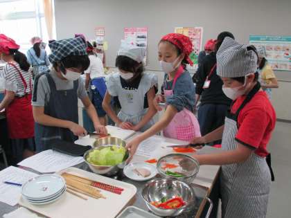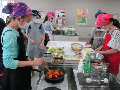 6年生の家庭科では、野菜炒めの調理実習をしました。グループで協力して、野菜を切ったり、火加減に気を付けながら炒めたりしました。最後には自分で作った野菜炒めをおいしそうに食べていました。