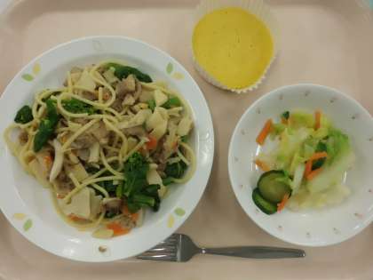 菜の花とたけのこのスパゲティ・牛乳・春きゃべつの即席漬け・キャロットケーキ