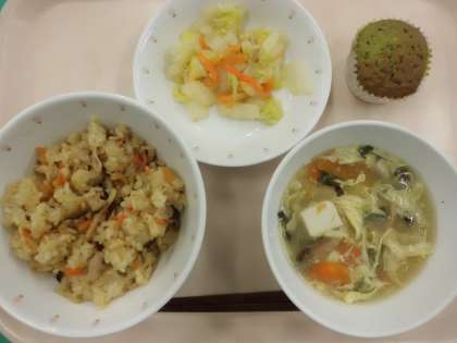 中華おこわ・牛乳・辣白菜・にらたまスープ・お茶マドレーヌ