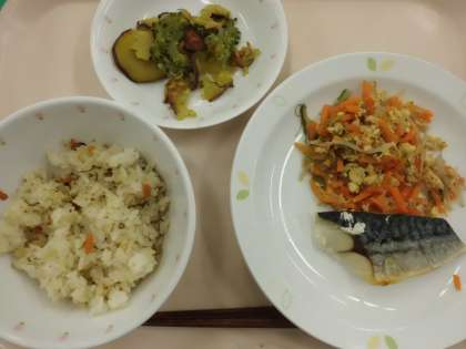 ししじゅうしぃ・牛乳・さばの塩焼き・にんじんシリシリ・ゴーヤ入り野菜チップス