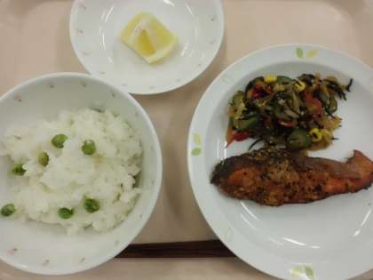 グリンピースごはん・牛乳・魚のごまフライ・大根とひじきのサラダ・くだもの