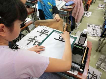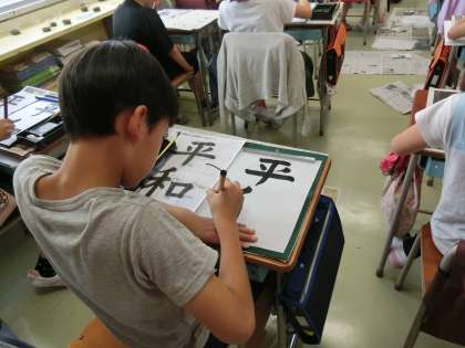 5年生の書写では、「平和」という字を書きました。一言もしゃべらず、字に向き合っている姿勢はとても立派でした。とめ、はね、はらいなど基本的なことをしっかりと身につけさせたいと思います。