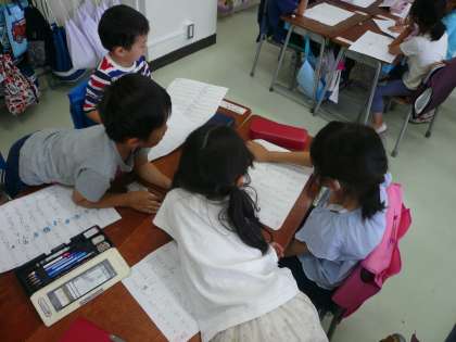 のねじめしょういちさんの詩を、自分たちの言葉で考え直して、オリジナルの詩をつくりました。おたがいのよかった文を集めてすてきな詩ができあがりました。
