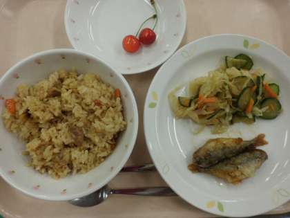キムチチャーハン・牛乳・まめアジの南蛮あげ・中華サラダ・くだもの