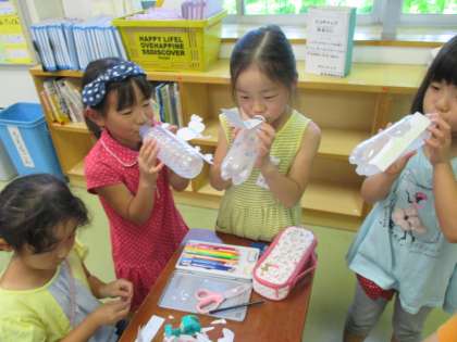思い思いの飾りを息で飛ばしました。