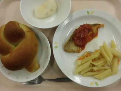 あしたばパン・牛乳・白身魚のチリソース・ペンネのソテー・くだもの
