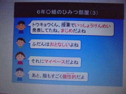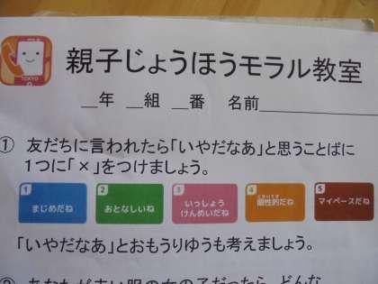 3時間目に親子情報モラル教室を行いました。講師の先生が、インターネット環境がどんどん整っていく世の中で、SNSを利用するときの注意点やネットへ画像を出す際の個人情報の流出などを、映像と資料を使って分かりやすく説明してくださいました。最後のまとめでは「みんなちがいがある」「メッセージはよく考えて送る」「ネットの書き込みは取り消せない」「使い方やルールを話し合おう」と話がありました。インターネットを使用して生じるトラブルの相談窓口なども、子供たちの取り組んだワークシートの裏にありますので、ぜひ参考になさってください。参観いただいた皆さま、ありがとうございました。