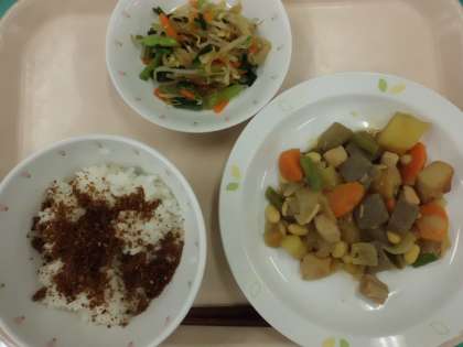 ごはん・牛乳・かつおでんぶ・豆入り筑前煮・からしあえ