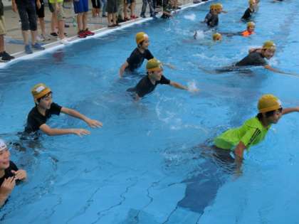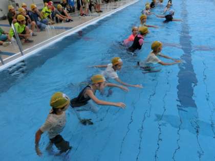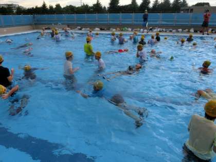 今日は着衣泳を実施しました。服を着た状態で、どのように泳いだり、動いたりすると助かることができるかを学びました。児童は服を着た状態で水の中に入ると、重たく、泳ぎにくいことに気づきました。