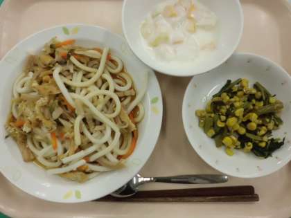 五目冷やしうどん・牛乳・あしたばとコーンのソテー・フルーツヨーグルト