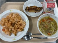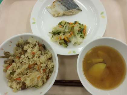 きのこごはん・牛乳・さわらの西京焼き・くきわかめのサラダ・さつまいものみそ汁