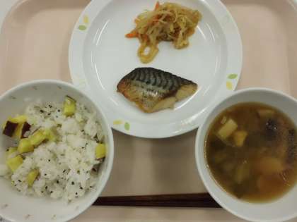 さつまいもごはん・牛乳・さばの照り焼き・ピリ辛野菜・秋なすのみそ汁