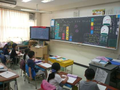 あげパン、カレーライス、ミートソーススパゲッティ、やきそばの4つの中から一番好きな物のカードを選び、黒板にはりだしました。カードがはりだされた黒板を見て、何が一番多いのか、何が一番少ないのか考えてみましたが、少し見づらさが。