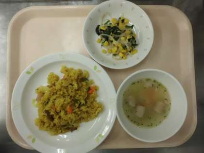 ツナピラフ・牛乳・ほうれん草サラダ・キャベツとウインナーのスープ